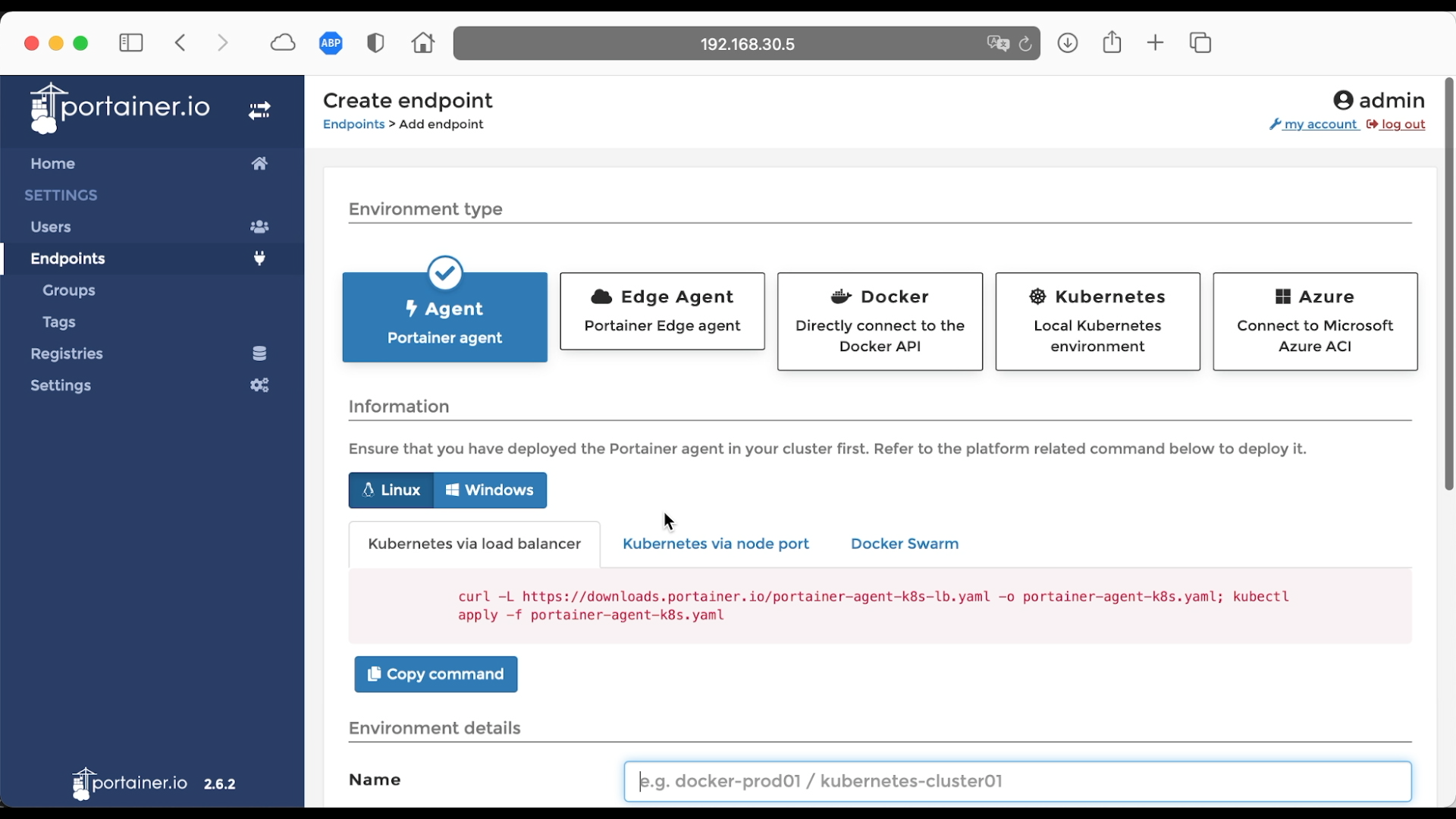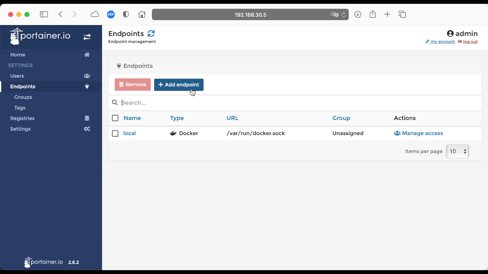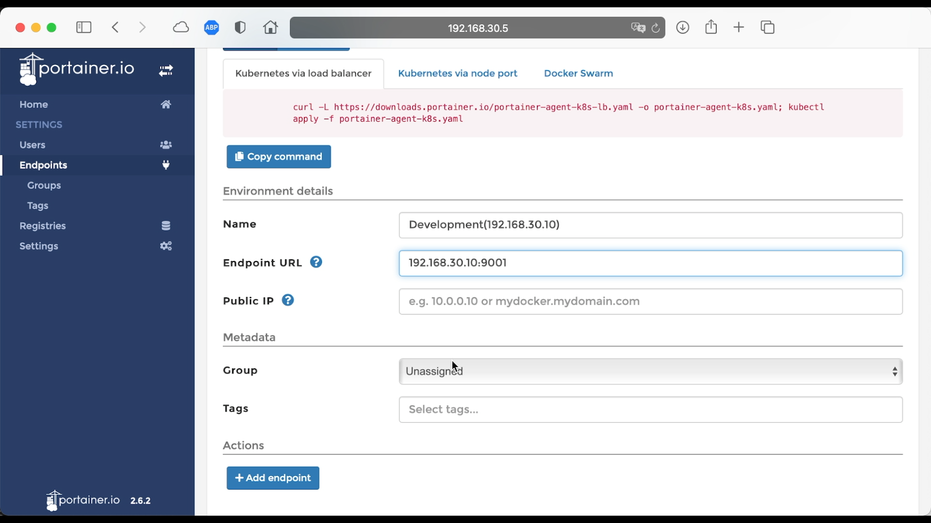 添加代理 Docker,左边菜单点击 Endpoints,然后点击 Add endpoint