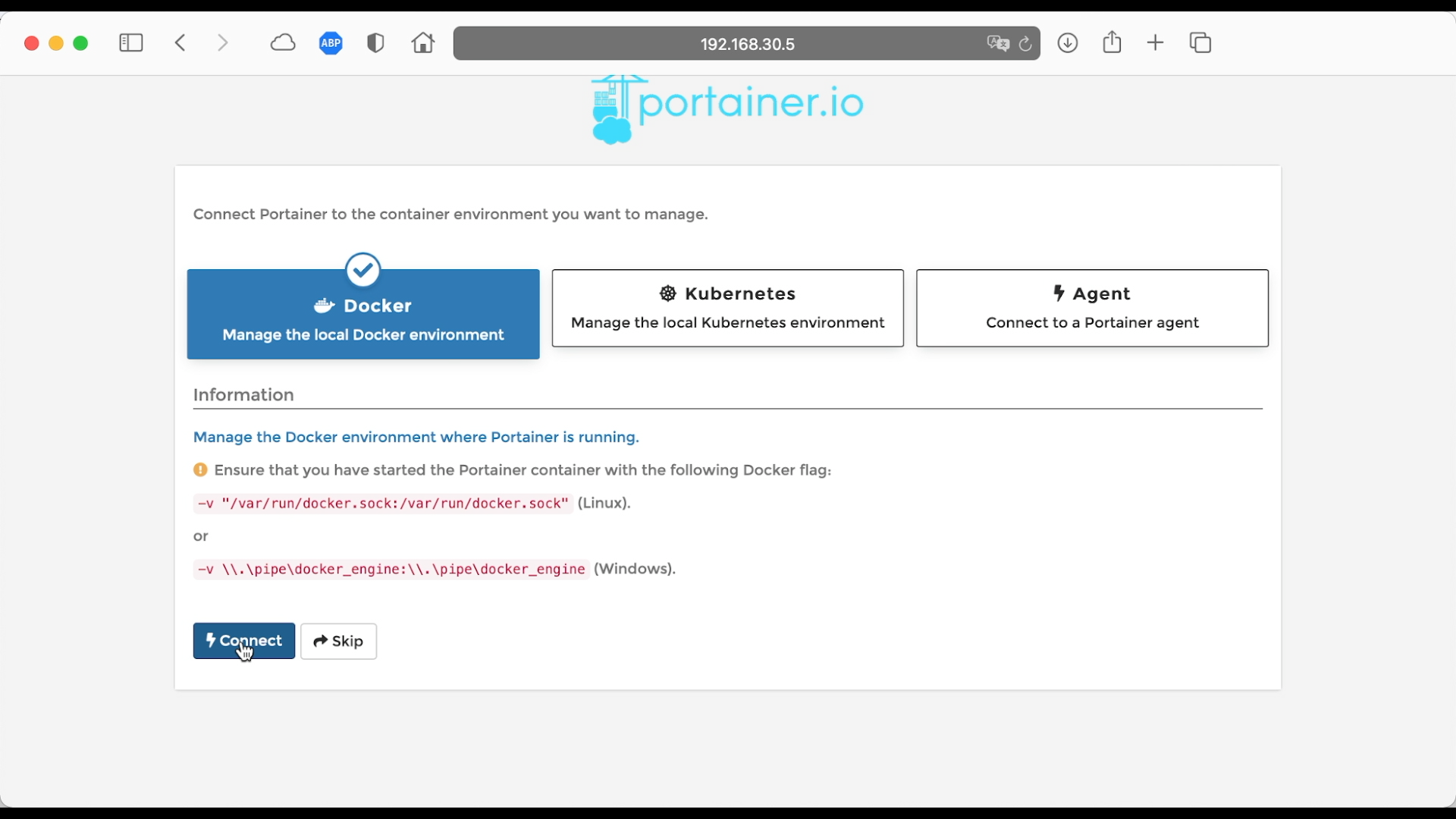 当前界面中有三个选项,分别是 Docker(本地 Docker),Kubernetes, Agent(代理)