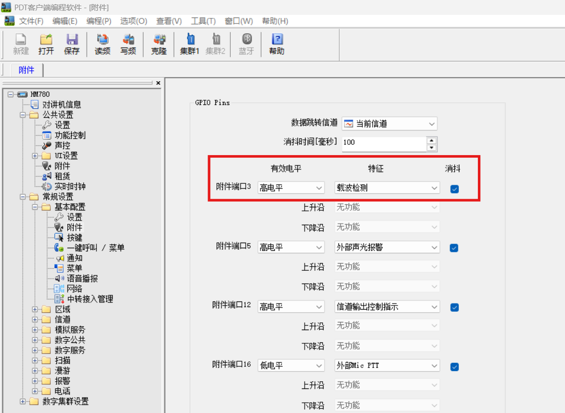 然后,进入 CPS 写频软件,在“常规设置”,“基本配置”,“附件”中设置 "GPIO Pins",将“附件端口3” 设置为 “高电平”,特征选择 “载波检测”