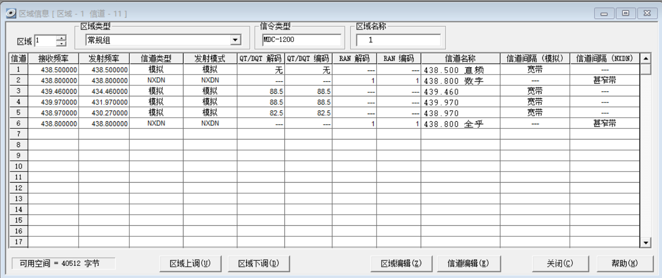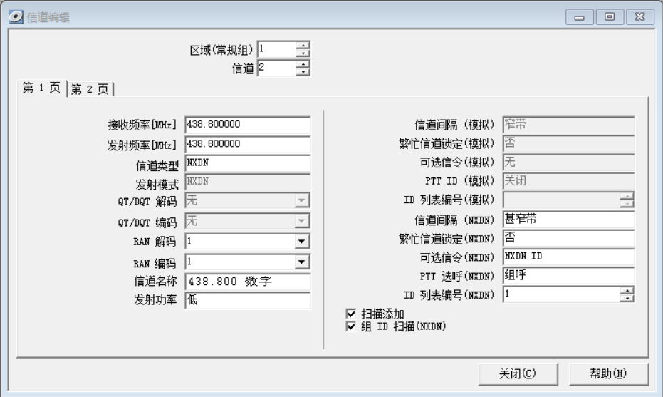 例如第二行 438.800 发射接收相同,信道类型和发射模式选择NXDN,信道名称随意,注意:信道间隔(NXDN)一定要选择 甚窄带(6.25K 带宽)